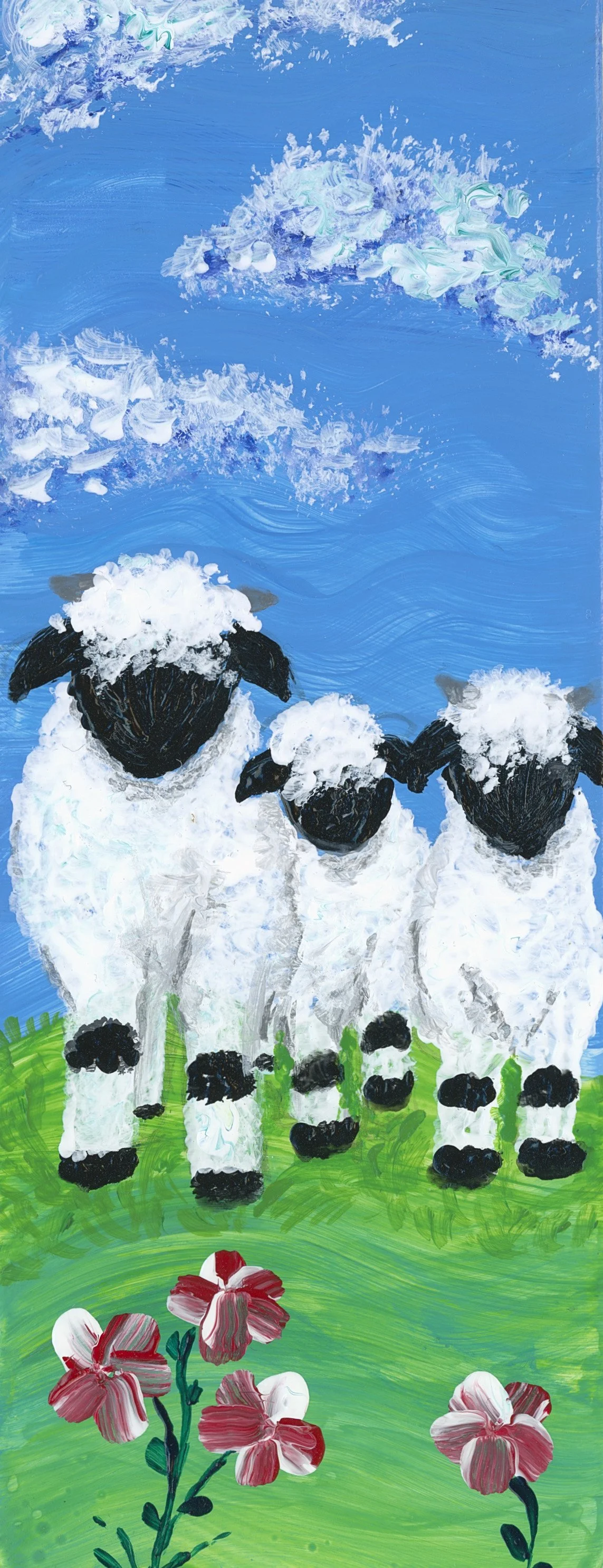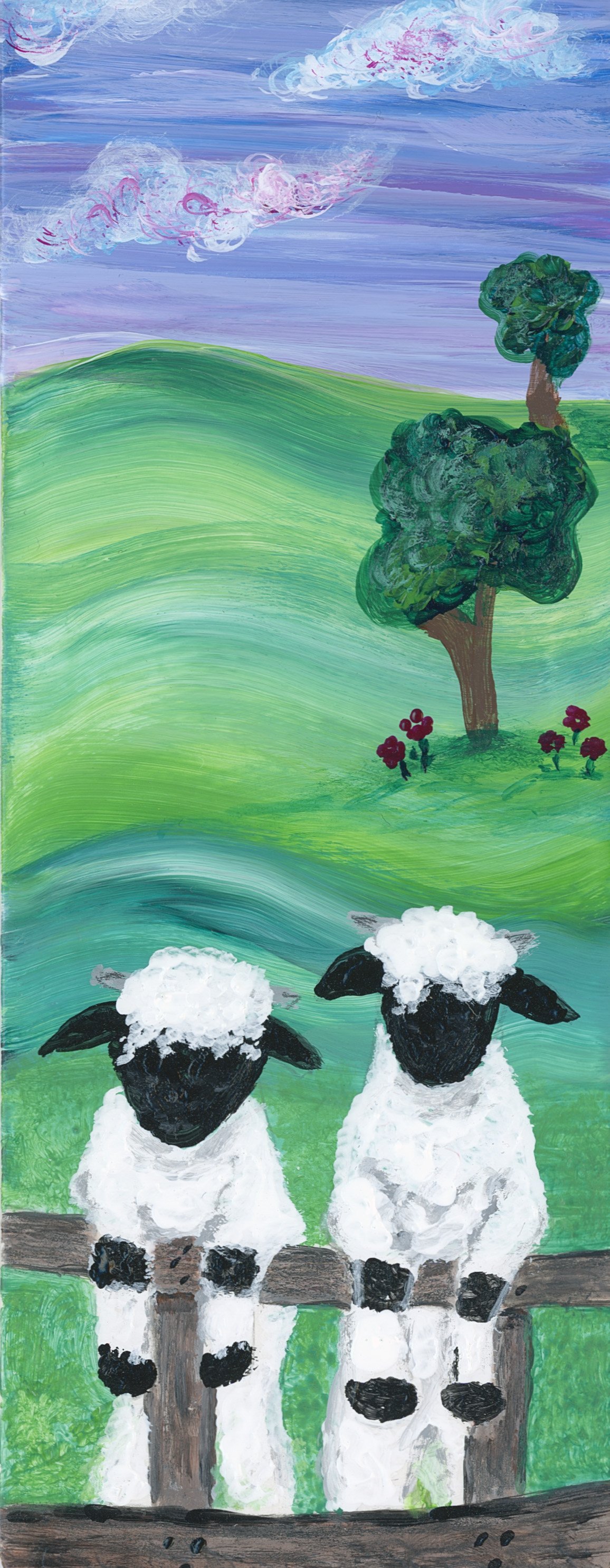 This was my first commission as an artist and it was a great experience. I found it enjoyable painting with a mission so to speak. The best part was when the customer saw the work and fell in love with it, so rewarding. These are her favourite sheep and they sure were fun to paint.